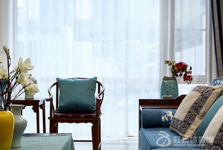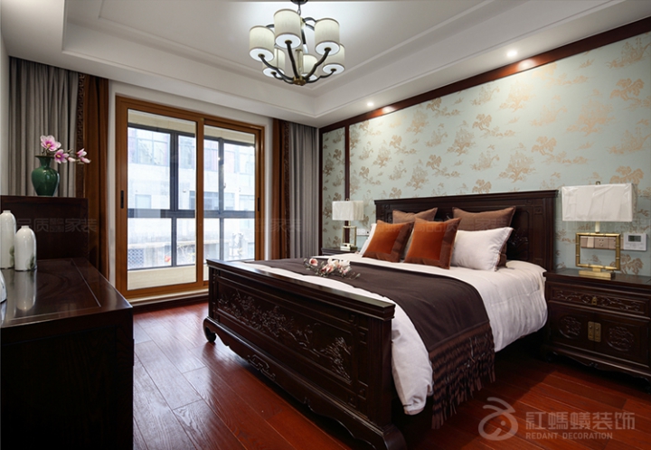 采用对程式的布局方式,造型朴素优美,色彩浓重而成熟。在装饰细节上崇尚自然情趣,花鸟、红木、陶瓷、大理石、古玩等精雕细琢,富于变化,充分体现中国传统美学精神。