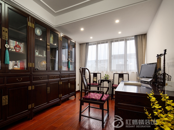 书房是一个满足居住者闲情雅致的地方,也是一个展现居住者内在涵养的重要空间,书房间的实木书架、书桌椅、以及写意山水画等装饰点缀,彰显出中式风格内敛儒雅的气质。