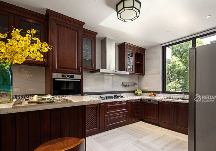 开放式厨房是门厅和客餐厅的一个过渡空间,以深色木作打造的西厨采用开放式格局,西厨的吧台是操作台亦是早餐台,设计用自然纹理的白色大理石提亮空间,减少视觉上的沉闷与压抑,增添了家人间的情感交流和互动。