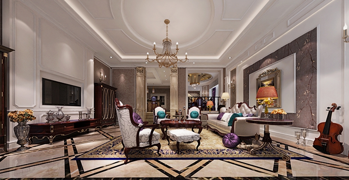 设计说明:将现代元素和美式相结合,设计主题为奢华美式,公共空间运用白色木饰面和深色欧式纹样壁纸作为空间的主题材料。同时配以加入金属元素的家具,米色软包的欧式家具来舒缓整体色调,空间更加融合自然。