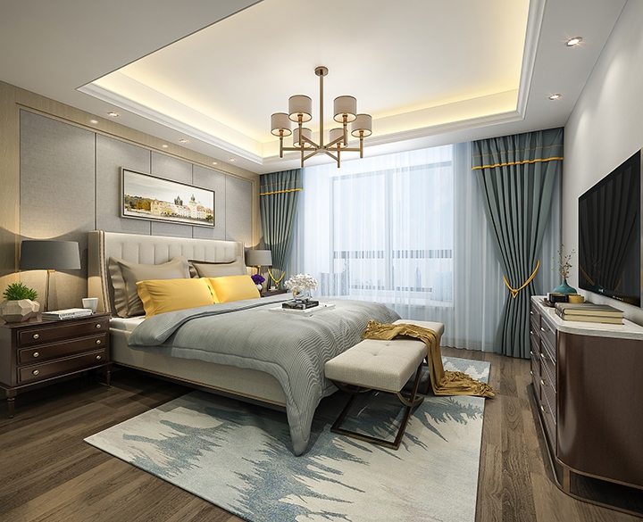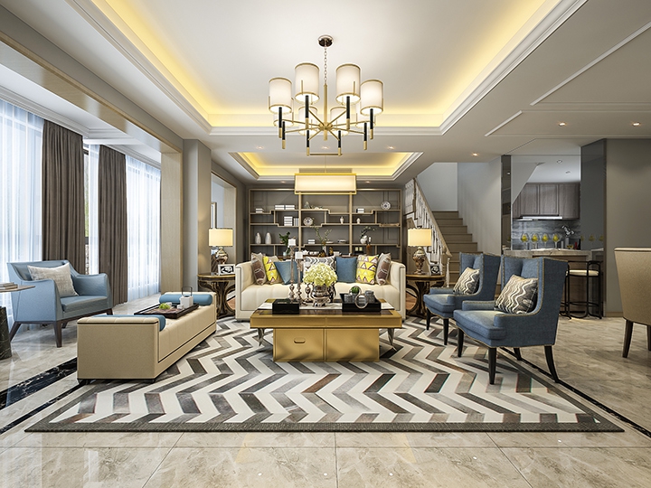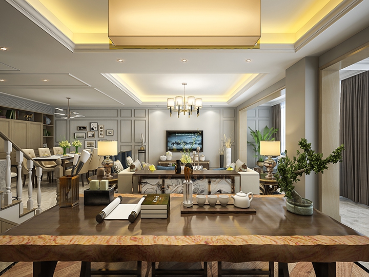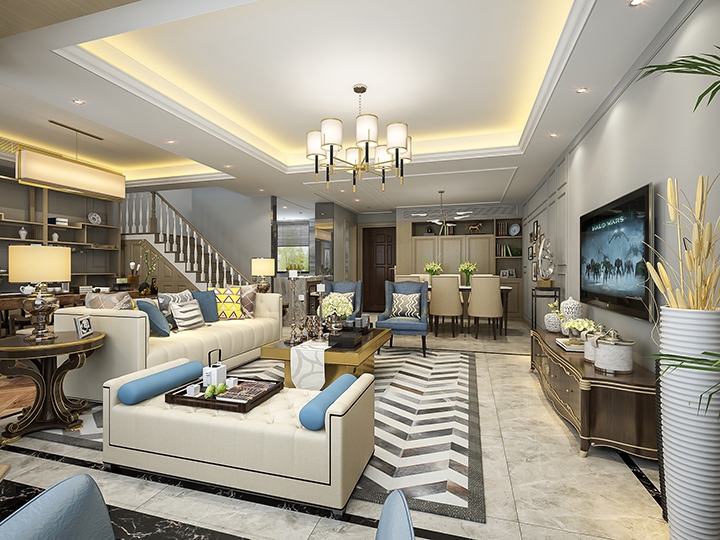设计说明:本案设计定位于现代轻奢风格。客厅作为待客区域,通常请求简练明快,一同装饰较其它空间要更明快光鲜,通常运用很多的石膏线造型和木质柜子的装饰;这不只反映在软装摆件上对仿古艺术品的喜欢,一同也反映在装饰上对各种灰色石膏造型的偏爱。客厅选用暖灰色为主色彩。充溢美式及现代轻奢元素的客厅,吊顶让空间显得愈加华贵。