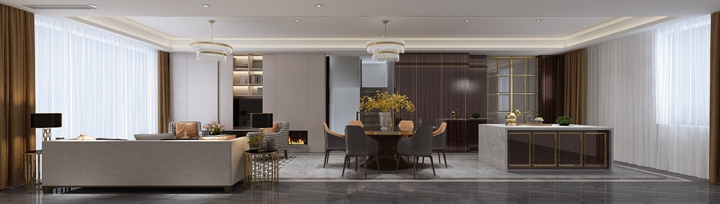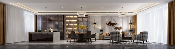 客餐厅布局上打破了传统的布置,为加强文化传承和书香氛围,客厅采用了隐形式电视和合围式的沙发布局,休闲娱乐的同时增进了家人的情感交流,电视背景柜同时也增加了收纳空间。独立式西厨也为友人和家人的交流增加了情趣。