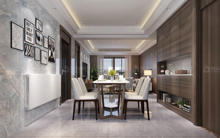 设计师将厨房打通,中西厨房的完美融合赋予了空间更多生活气息。开放式设计让空间没有了距离,动线的明晰让驻足走动的互动空间更加自由。红蚂蚁装饰基于业主注重生活品质,在保留尺度的同时,设计师以点式布置强化艺术氛围,强调空间内在的魅力。
