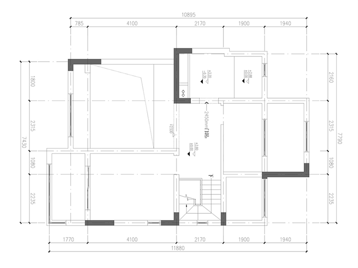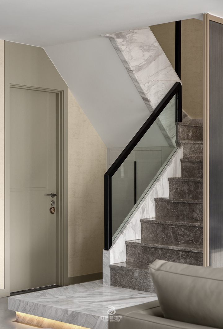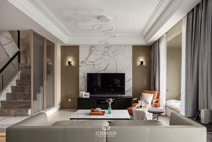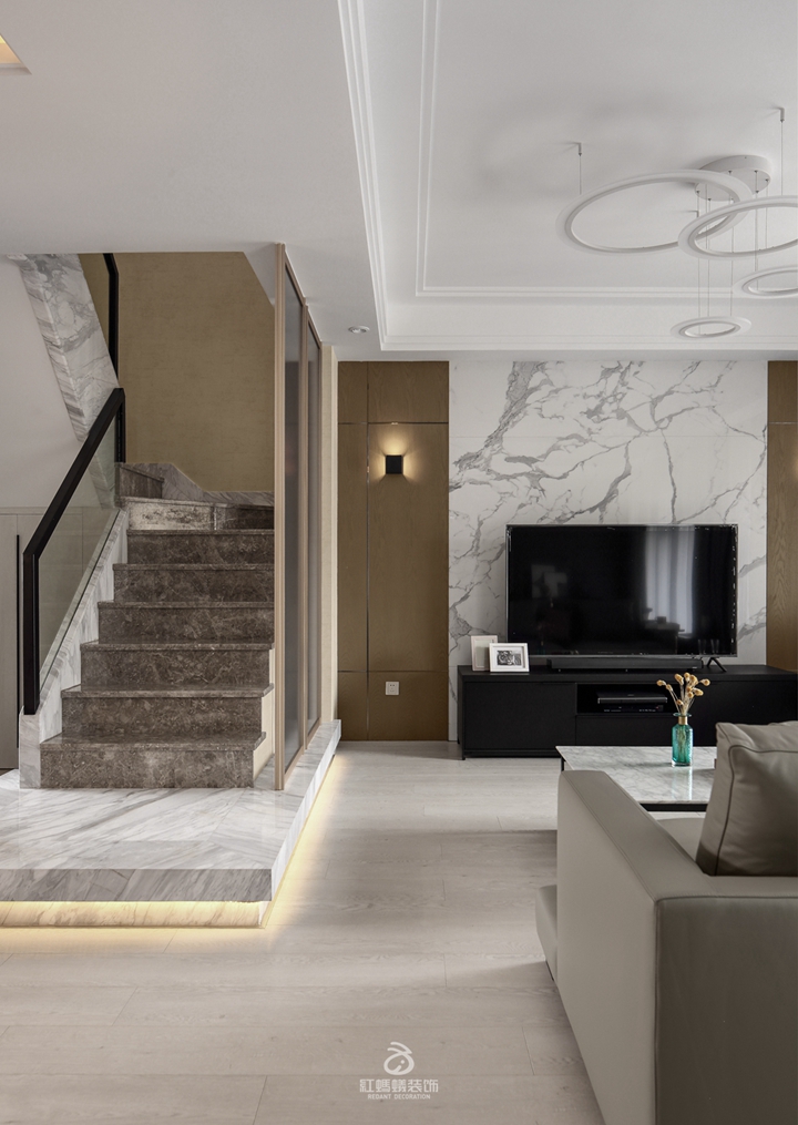 本案借用大理石的整洁与天然的纹理特征,将其大量运用于装饰上,电视背景墙是与业主一起精心挑选的鱼肚白大理石,楼梯则运用了爵士白云朵拉灰大理石拼色,使整体感觉显得简洁大气。