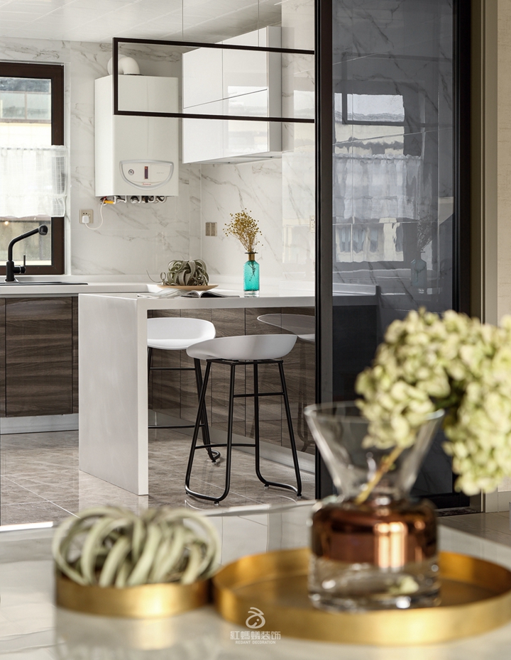 厨房在满足日常功能需求的同时,增设了吧台,为平日的简餐、品茗提供了一个富有情调的角落。黑色金属推拉移门配上墨色玻璃,让整体色调统一的同时,尽显浓浓的品质格调。