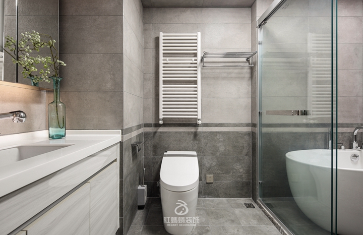 干湿功能区通过玻璃移门很好的进行阻隔,宽大的浴缸与淋浴区放在一起,节省空间的同时功能齐全,带烘干功能的毛巾架及智能马桶预留插座等功能性配件也一应俱全。