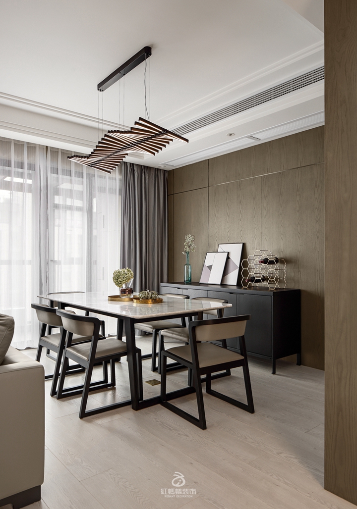 餐厅的实木护墙板背景嵌上金属线条,与电视背景墙相呼应。黑灰色系的餐边柜和餐桌椅与客厅沙发茶几呼应的同时,将简洁的风格特色展现的淋漓尽致。