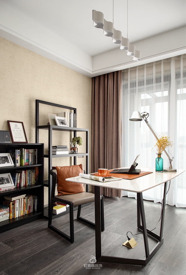 书房的着重点在软装的搭配上,遵循整体居室黑灰的色调,书架及桌椅的搭配上也将这份简约延续,大理石台面的书桌成为整个空间的一个增色亮点。