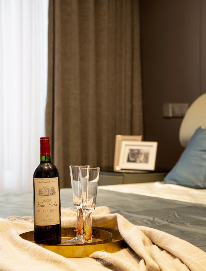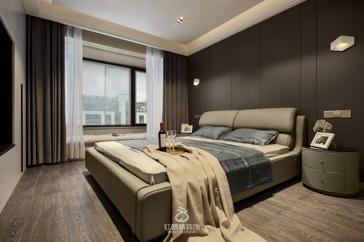 卧室的整体色调偏暗,但不沉闷,床头的软包背景墙将冰冷的墙面覆盖,给人一种温暖的感觉,拉上窗帘在此美美睡上一觉,妙哉!