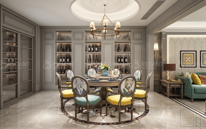 餐厅的设计低调奢华,餐桌背后矗立的酒柜,上面摆放着各种美酒及酒具,在享用美餐时浅酌一杯,真是一种享受。